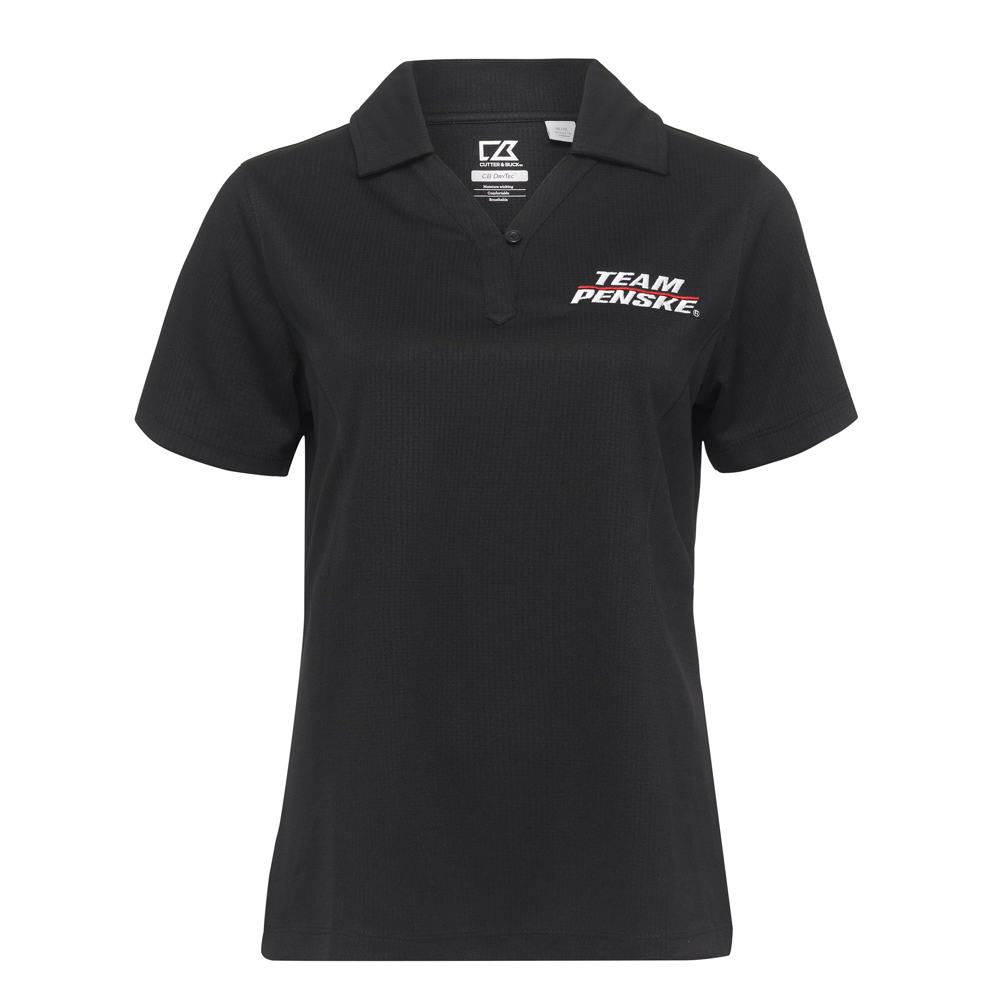 Black Ladies Cutter Buck Drytec Genre Polo with “Team Penske” logo embroidered to left chest . A silky, lightweight polo with a textured weave and CB DryTec moisture wicking technology to keep you cool and comfortable. Features a self fabric collar, pieced one-button placket, princess seams for shaping, open sleeves, straight hem, and pennant embroidery at the back half moon. Machine wash.