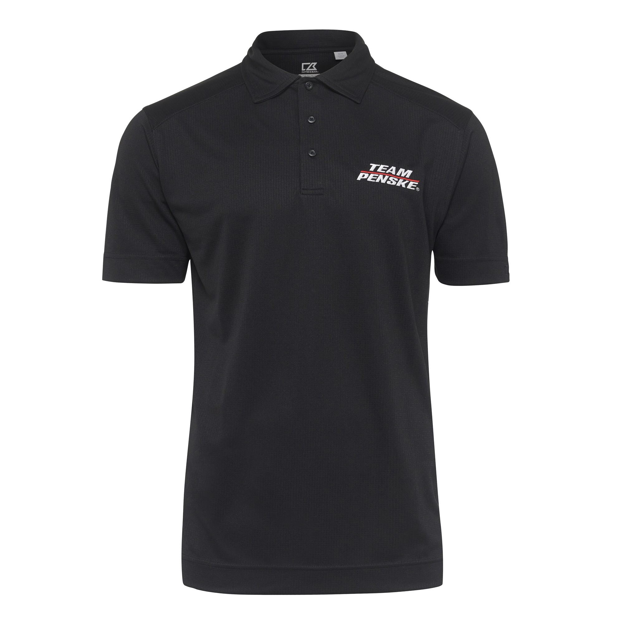 Black Men’s Cutter Buck Drytec Genre Polo with “team Penske” logo embroidered to left chest. This machine-washable, 100% polyester CB DryTec jacquard with side panels and